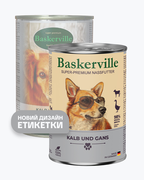 Вологий корм Baskerville – це повноцінний збалансований корм суперпреміум класу для собак з нормальною та підвищеною активністю. М’ясо теляти багате на поживні речовини, за змістом біологічно активних речовин телятина вважається одним з найбільш корисних видів м'яса, причому навіть під час термічної обробки більша частина корисних речовин зберігається. Містить багато вітамінів групи В, холін та вітамін РР, які відповідають за здоров'я серцево-судинної та нервової систем, покращують травлення, регулюють рівень холестерину в крові. Корисні вітаміни та мінерали, що містяться в гусячому м’ясі, таких як калій, хлор і натрій сприятливо впливають на організм тварини та підтримують водний баланс, а сірка нормалізує всі обмінні процеси організму тварини. При постійному вживанні цих інгредієнтів налагоджується робота травної системи.