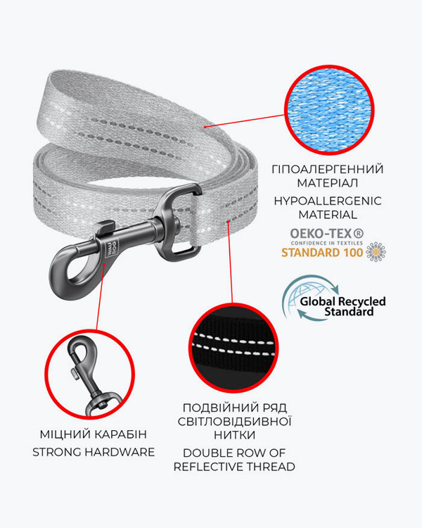 В цій серії продумана кожна дрібниця. М'яка на дотик стрічка дуже міцна. Вона гіпоалергенна та абсолютно безпечна для тварини. Вставки зі світловідбиваючої нитки та наявність розумного адресника з QR паспортом на нашийнику забезпечують додаткову безпеку. Стильні меланжеві кольори додають виробам привабливий вигляд.
